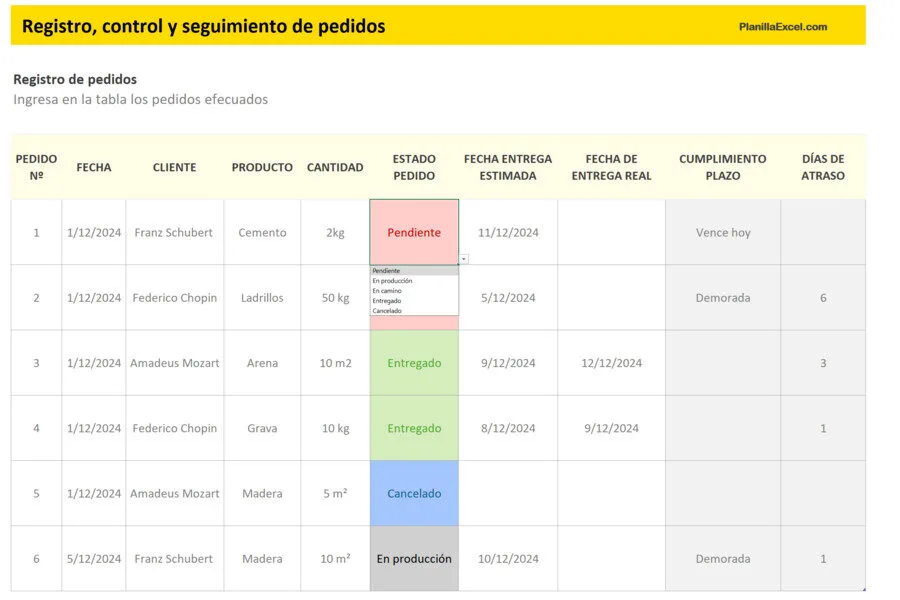 La plantilla de control y seguimiento de pedidos en Excel te permite registrar, organizar y analizar todos tus pedidos de forma sencilla y eficiente detectando aquellos pedidos que estƔn demorados para tomar las acciones correspondientes.